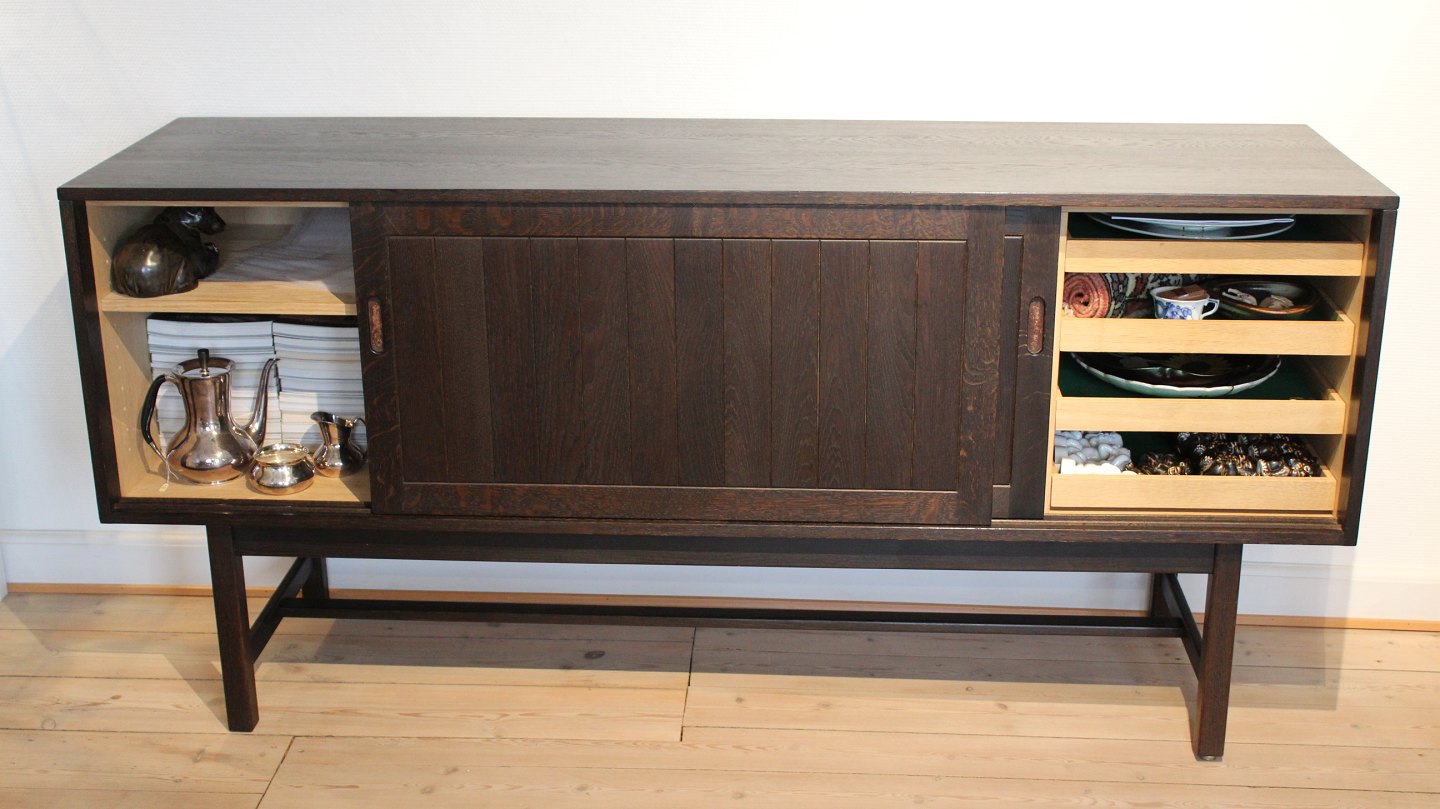 Lang lav skænk af mørk massiv og fineret egetræ