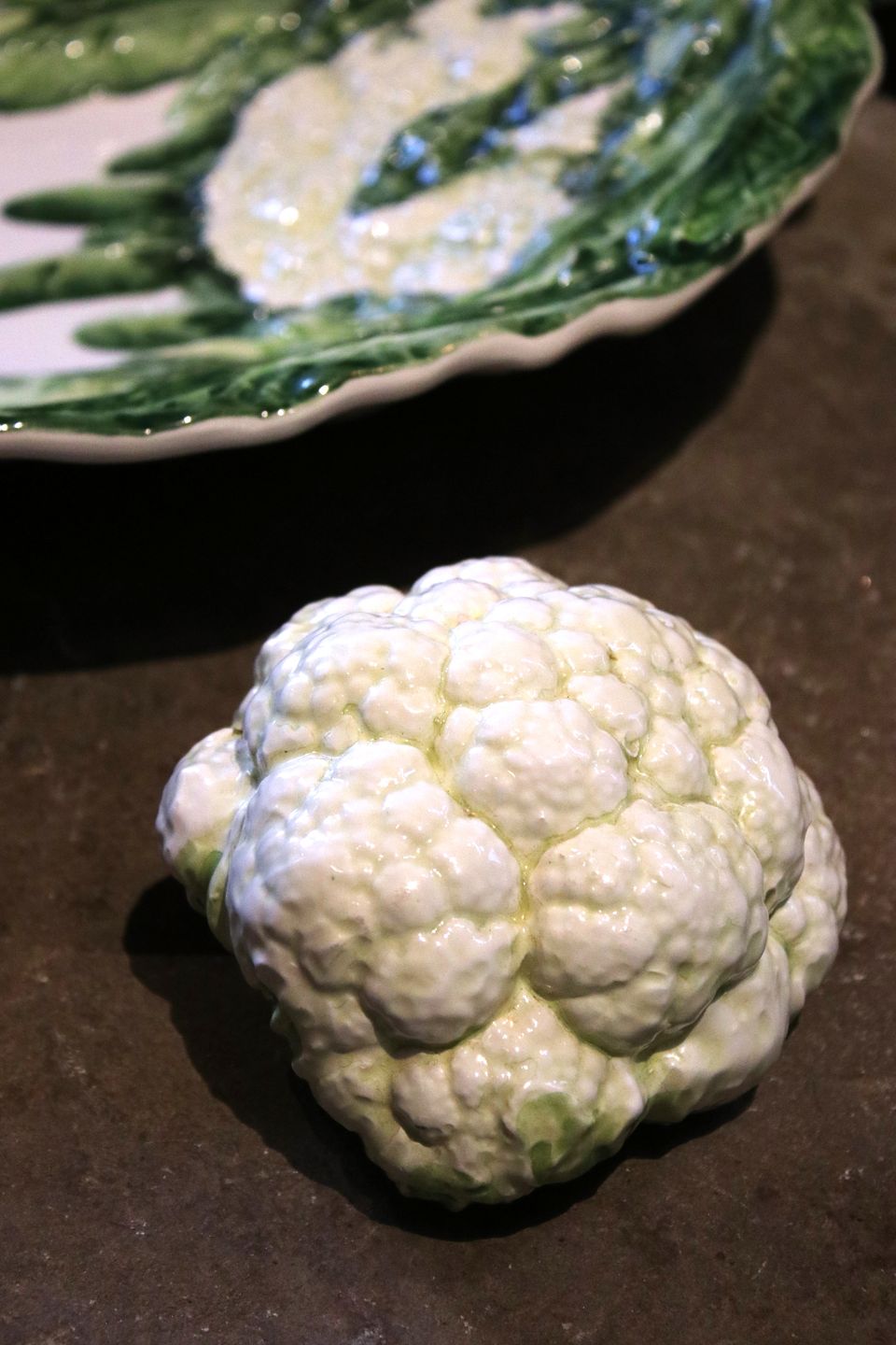 Dekorative , gamle italienske fajance grøntsager , et blomkålshoved og en artiskok.