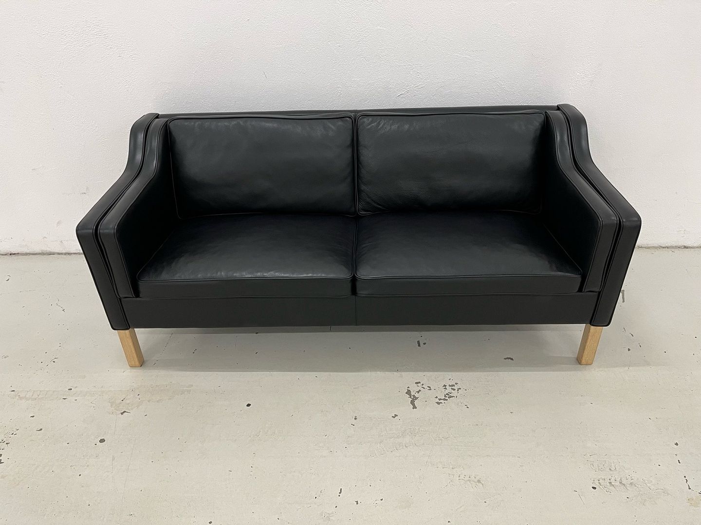 Denne eksklusive 2,5 personers sofa fra designer Mogens Hansen, model MH 195, fremstår i sort Odin 18 læder (gruppe 2) med elegante ben i sæbebehandlet egetræ. Sofaens oprindelige nypris var 37.511 kr.