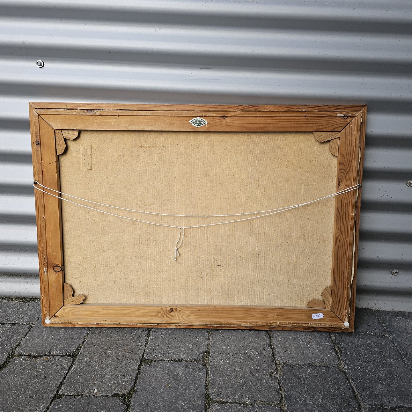 Oliemaleri på lærred med titlen Sommer. Monteret i træramme med motiv af et vandløb i en skov