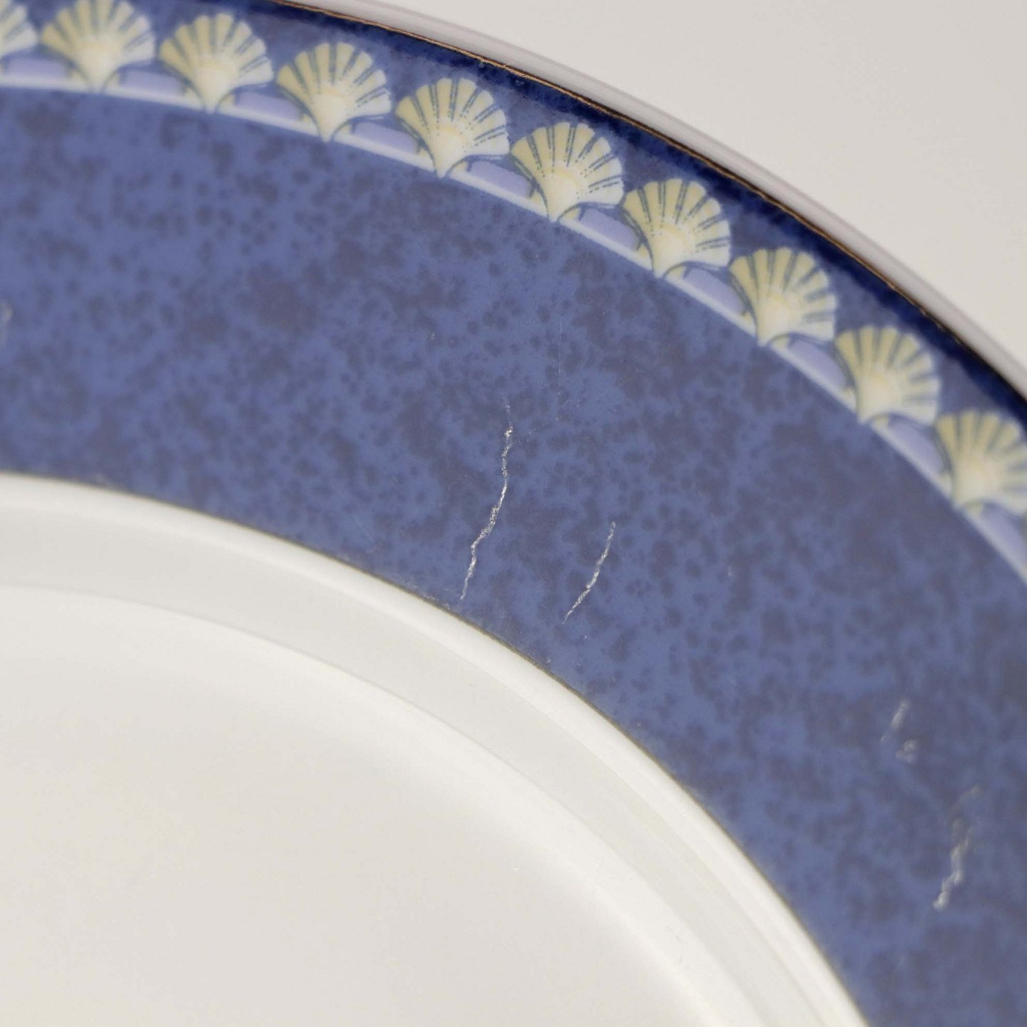 Service i glat hvid porcelæn med blåt bånd og dekoration af gule vifteformede strandskaller. Stellet kan gå i opvaskemaskinen.