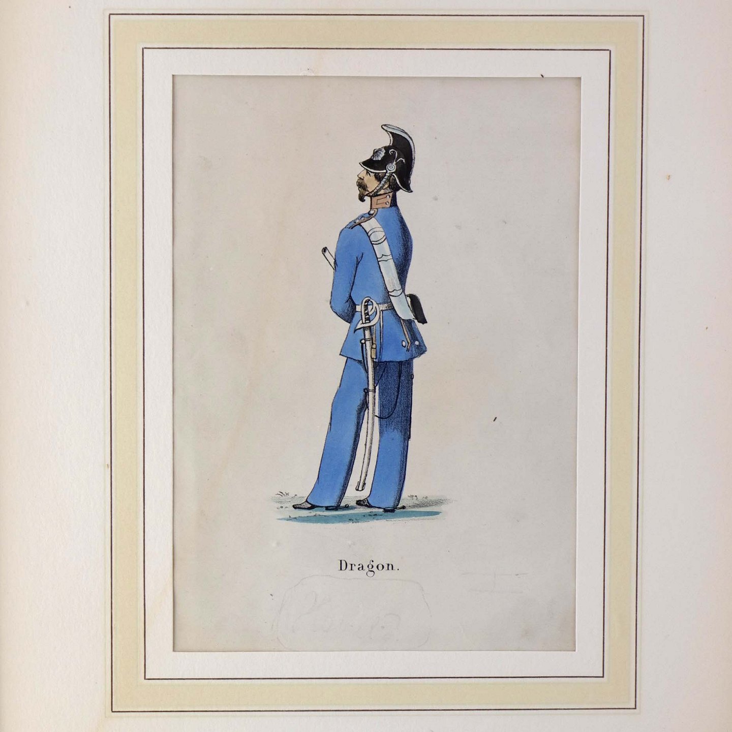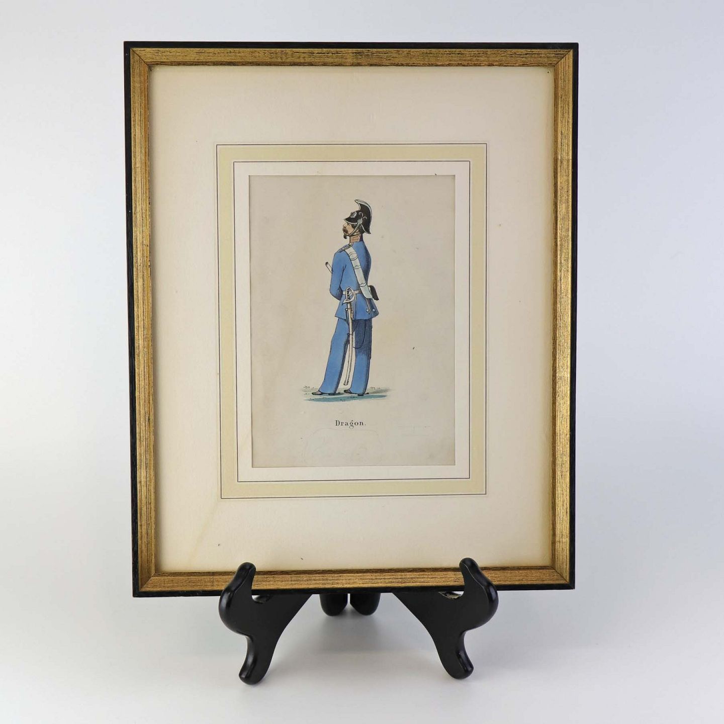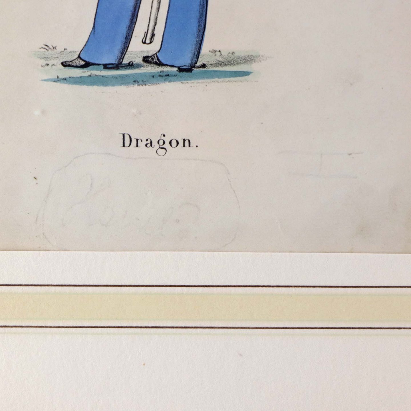 Originalt kobberstik fra år 1858 i træramme med teksten Dragon og motiv af en soldat i blå uniform.