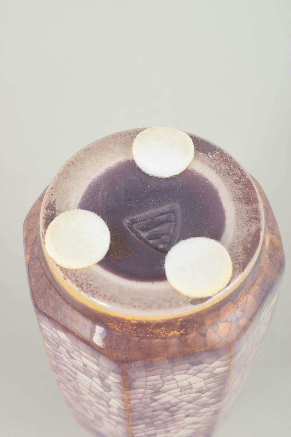 Dekorativ vase i stentøj med rillet overflade og lys glasur i creme og rosa nuancer. Formen er høj og let facetteret med en håndværksmæssig struktur, typisk for Marianne Starcks arbejde hos Michael Andersen & Søn. Stemplet i bunden.