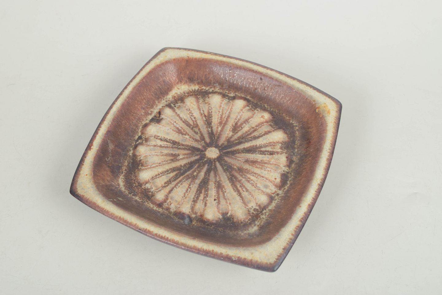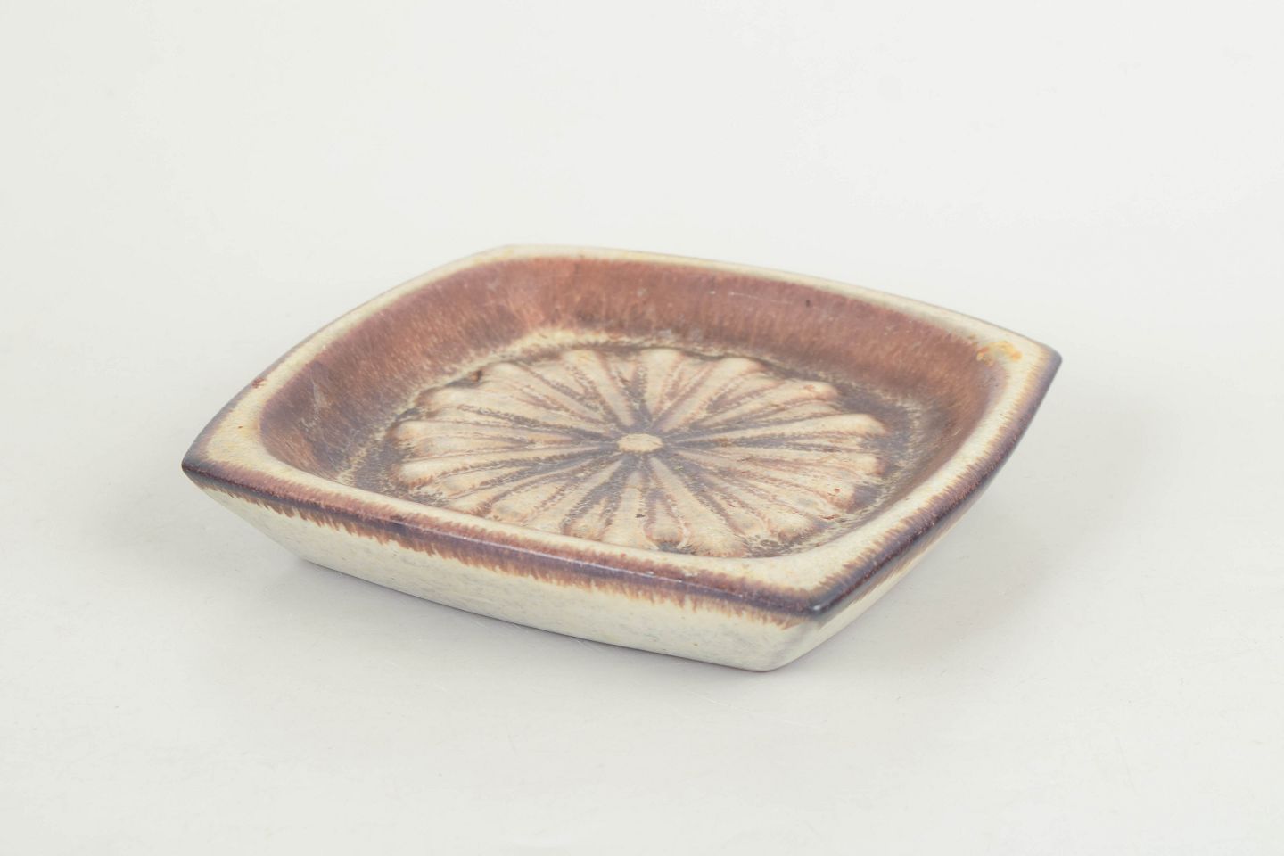 Dekorativt keramikfad i stentøj med karakteristisk relief og jordnære glasurtoner. Modellen fremstår med tydelig Bornholm tradition. Stemplet i bunden.