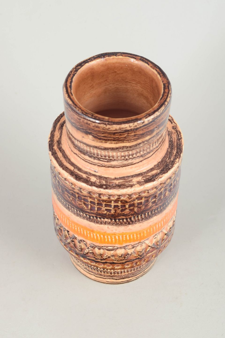 Dekorativ stentøjsvase med karakteristisk relief og horisontale bånd i jordfarver og orange nuancer, udført i klassisk italiensk stil fra 1970’erne.