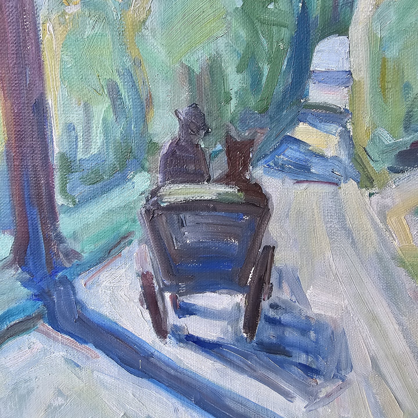 Oliemaleri på lærred med motiv af en vogn på en landevej monteret i gråmalet træramme