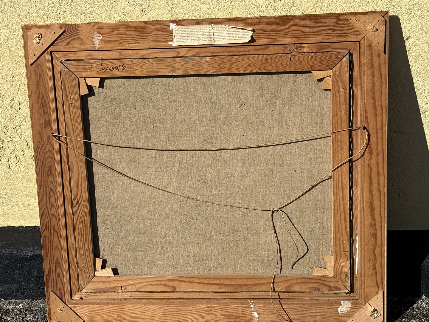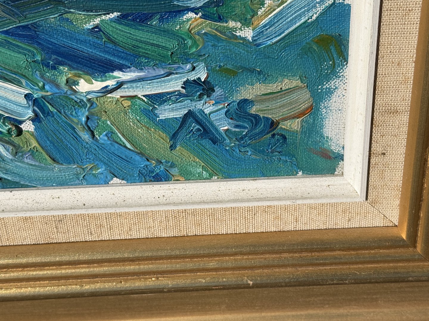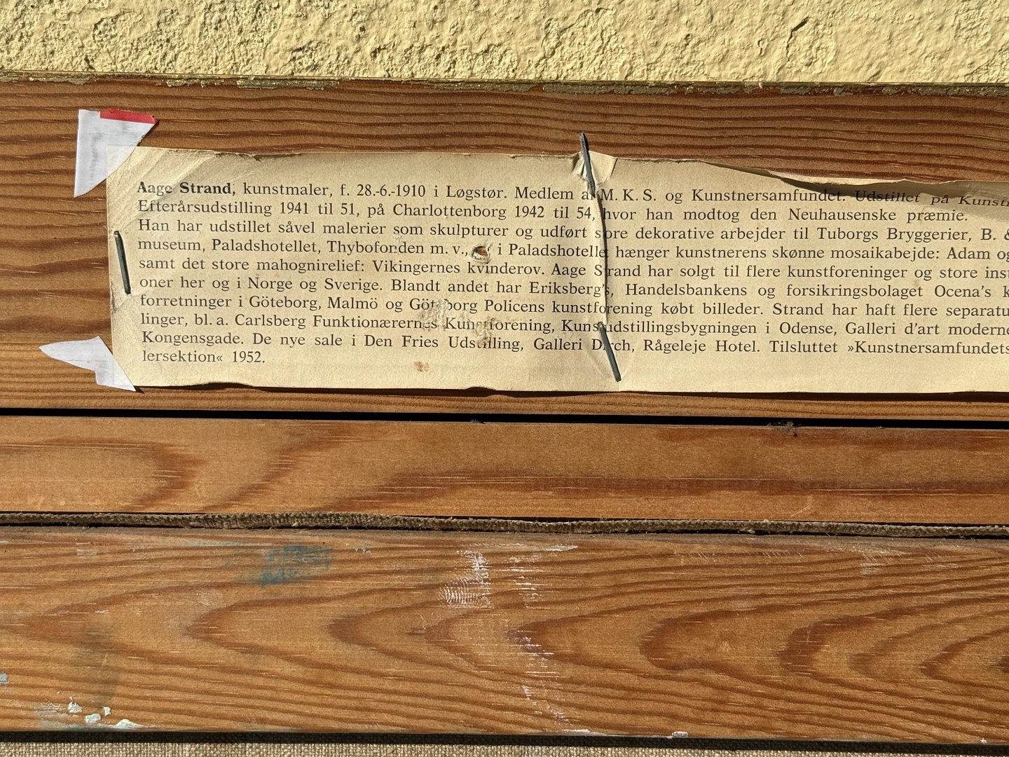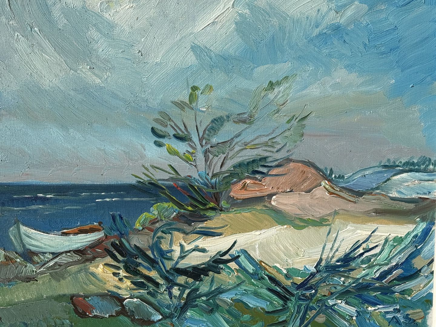 Aage Strand (1910-1975), oliemaleri på lærred, Båd ved strand, Signeret Å.S., mål med ramme 88x78cm *Fin stand*
