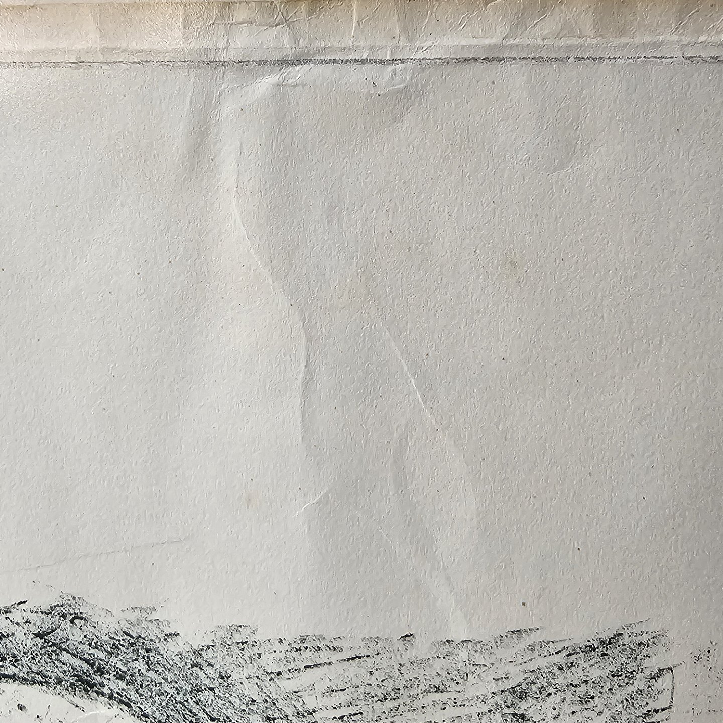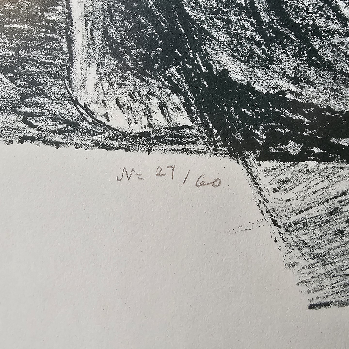 Litografi med motiv af en engel, som står over en mand på knæ. Monteret i sortmalet ramme, Tilegnet Kaj Erik Lindqvist