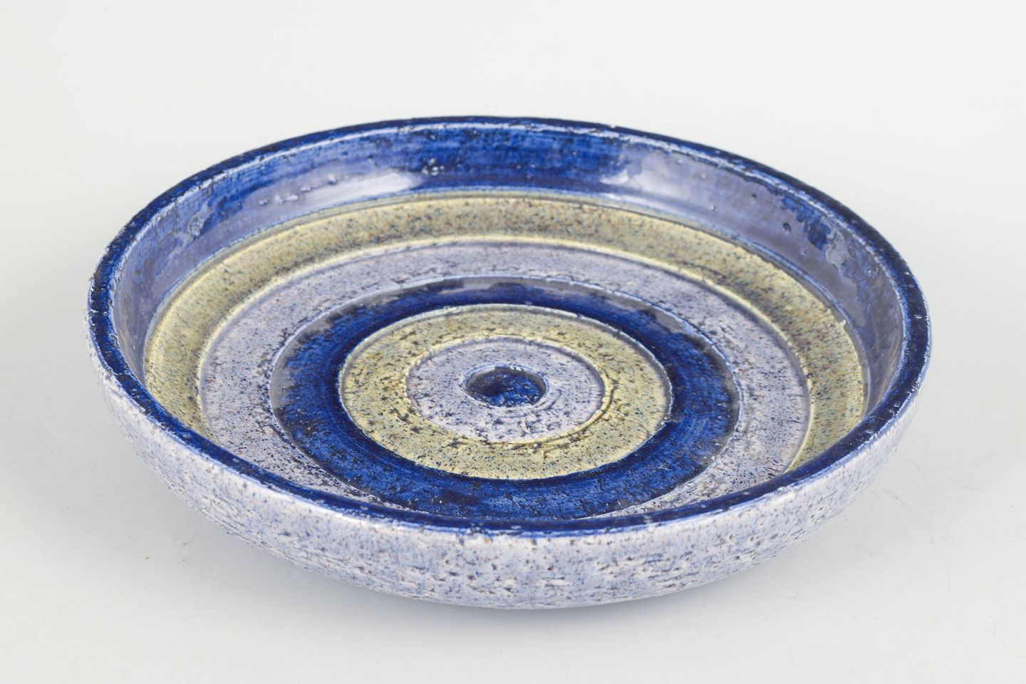 Håndlavet rundt fad i keramik med koncentriske ringe og karakteristisk glasur i blå, creme og sandfarvede nuancer. Udført i 1970’erne i Bitossis velkendte kunstneriske stil.