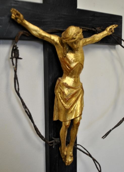 Forgyldt træfigur, Kristus på korset, 20. årh. Håndskåret. Figur ophæng på sortmalet kors med pigtråd. Signeret. H.: 41 cm. B: 24,5 cm.