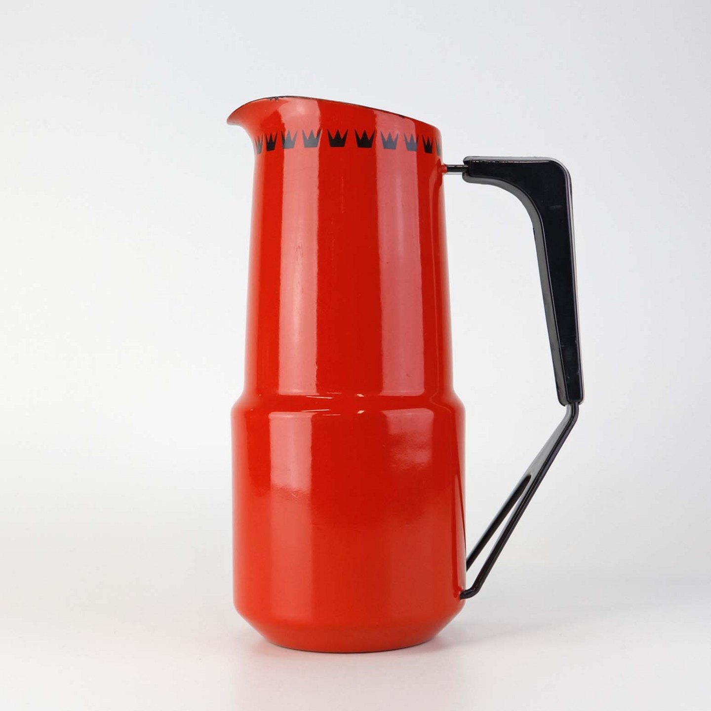 Dankok kande i metal belagt med rød, hvid og sort emalje og mønster af sorter tretakket kroner. Del af hanken er omgivet af sort plast.
