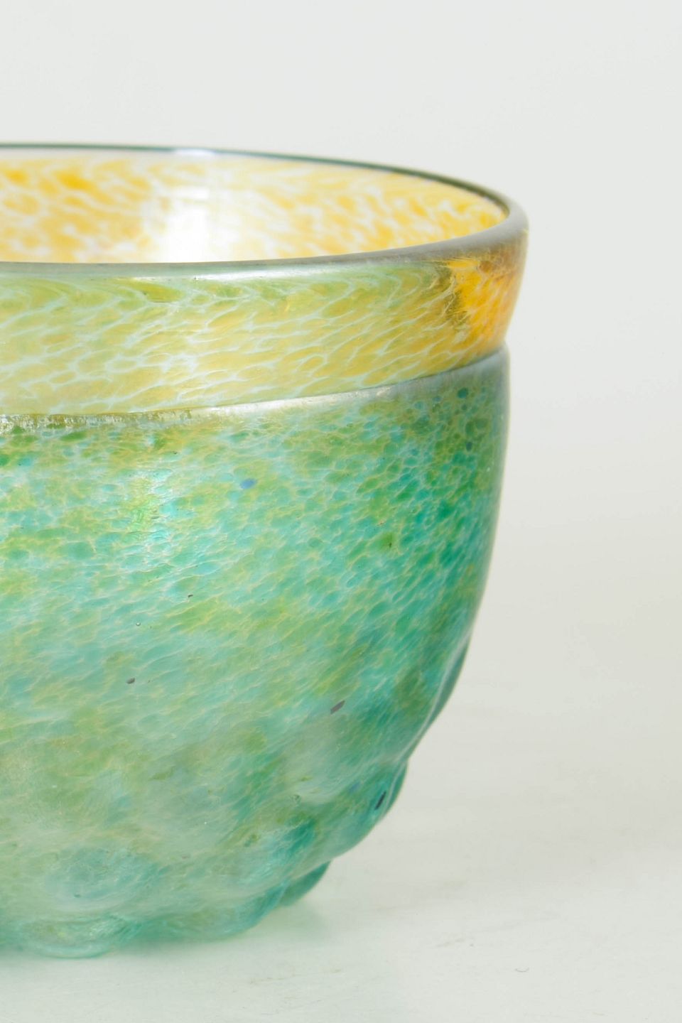 Mundblæst glasskål med organisk form og iriserende overflade i grønne og gyldne nuancer samt dekorativt indfanget mønster, signeret under bunden.