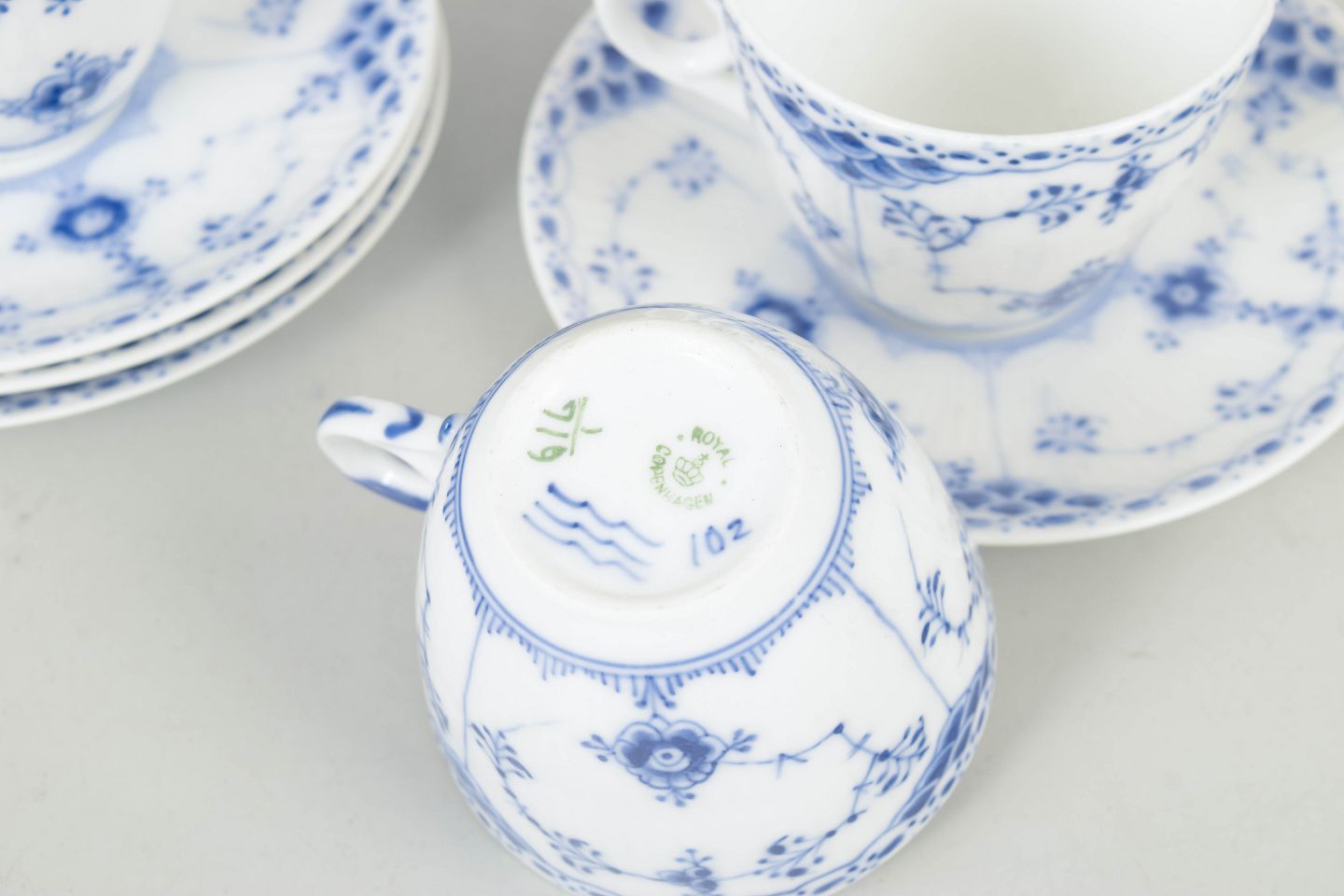 Royal Copenhagen Musselmalet Halvblonde, sæt af fire kaffekopper med underkopper.