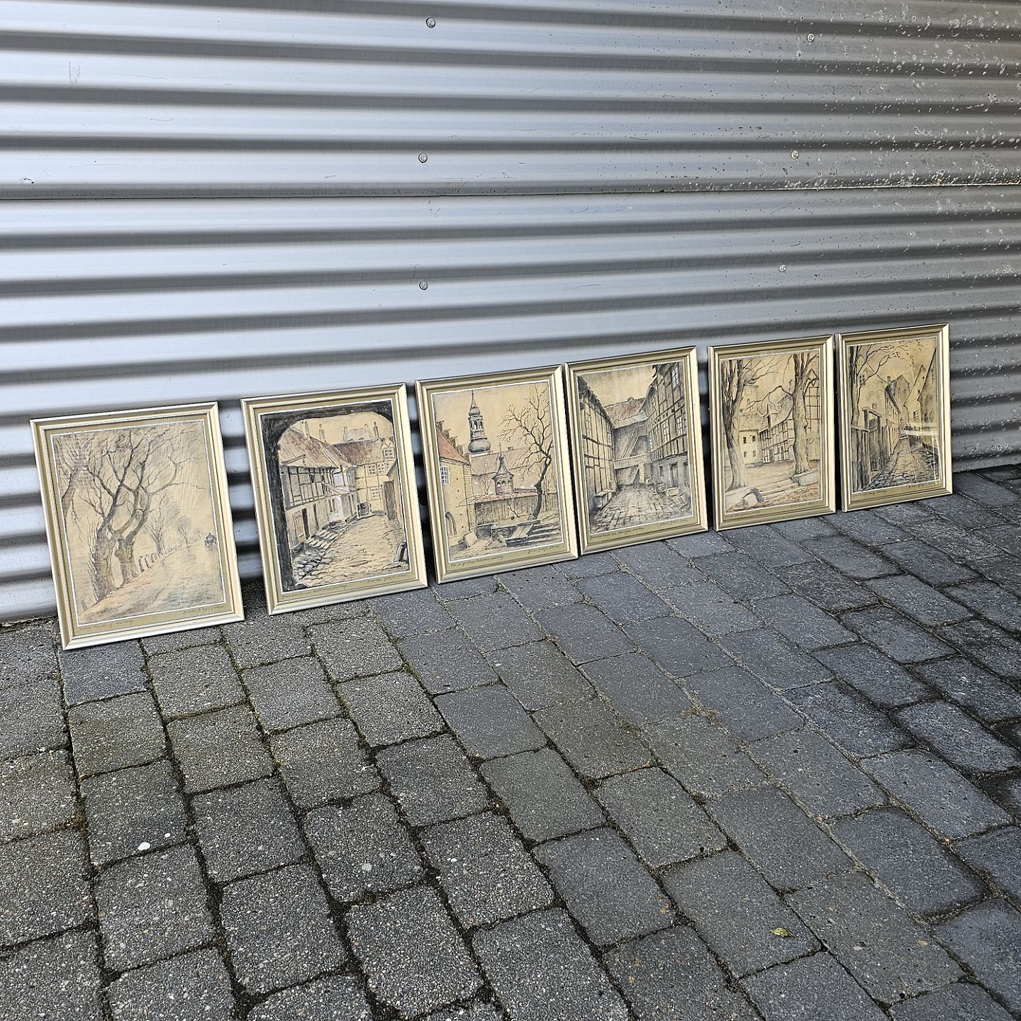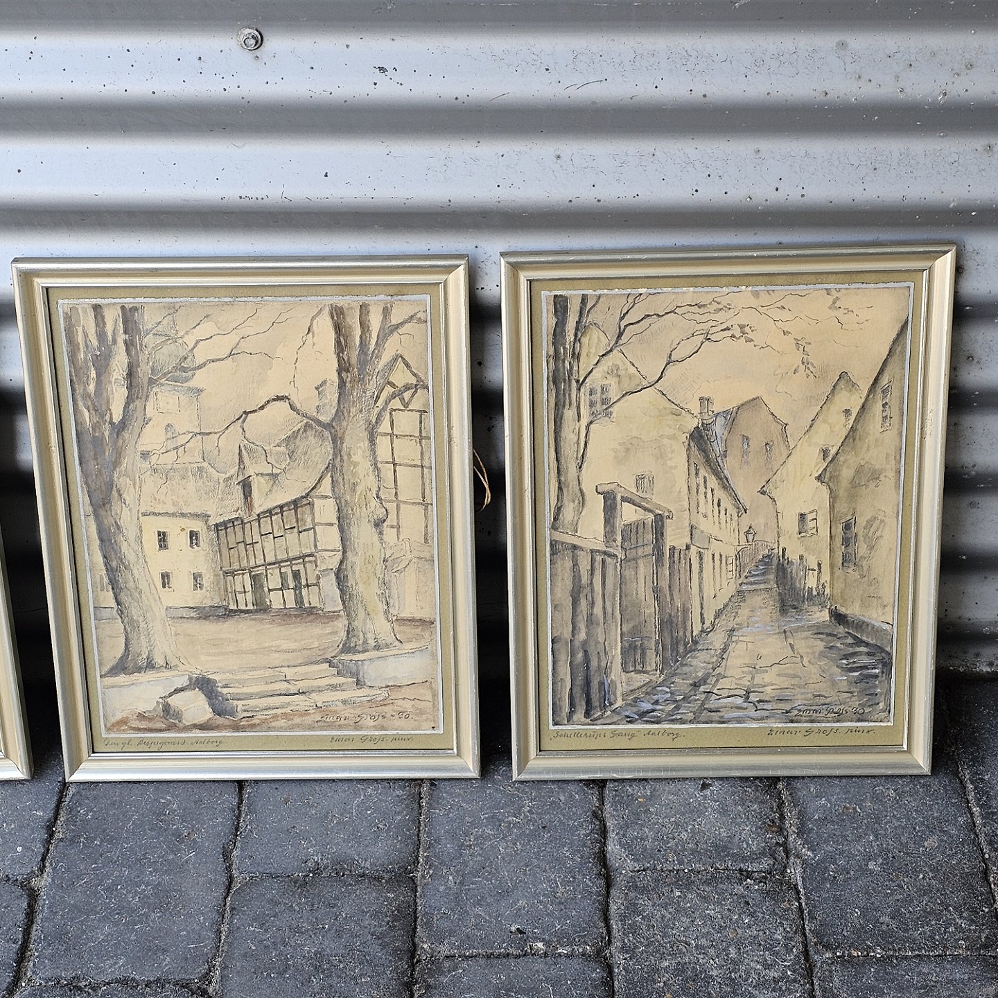 Sæt af seks akvareller med motiver fra Aalborg by, monteret i trærammer og alle signeret