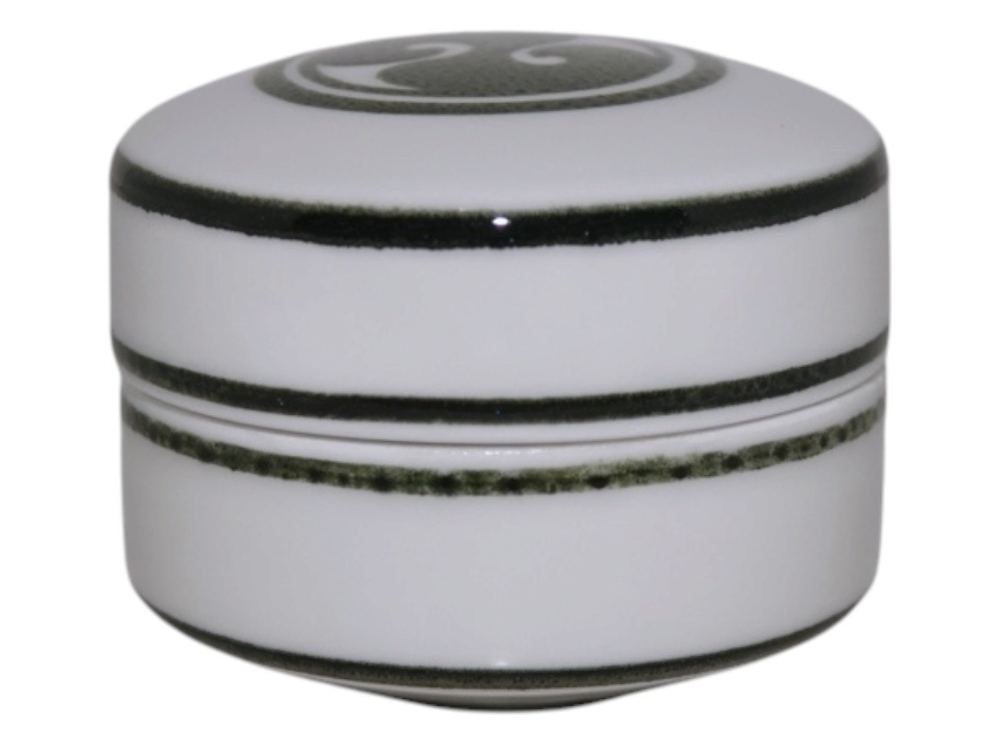 Royal Copenhagen kunstporcelæn, lille lågkrukke med grøn dekoration designet af Alev Siesbye.