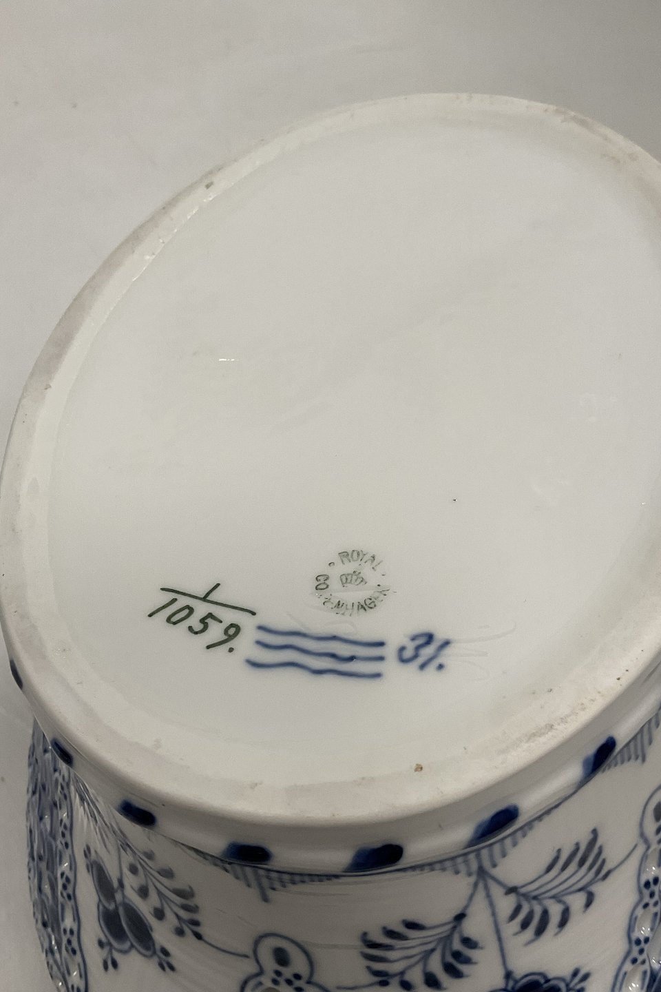 Royal Copenhagen Musselmalet Helblonde Frugtkurv/Oval Skål No. 1059. Modellør Emil Larsen, november 1892.