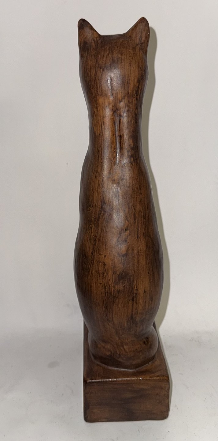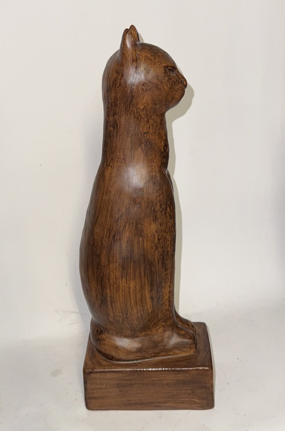 Figur af siddende kat i keramik af Emil Ruge. Dækket af brun glasur. Signeret af kunstneren på soklens inderside. H. 30 cm