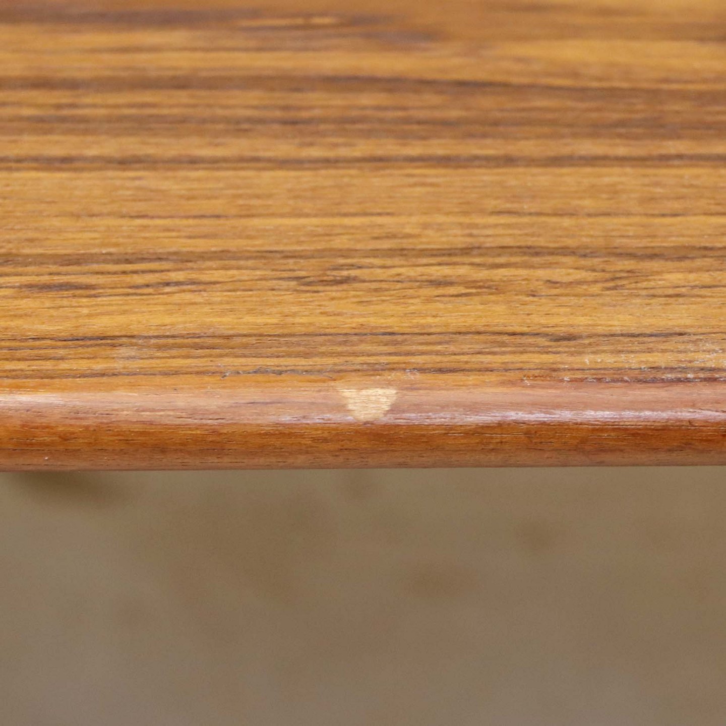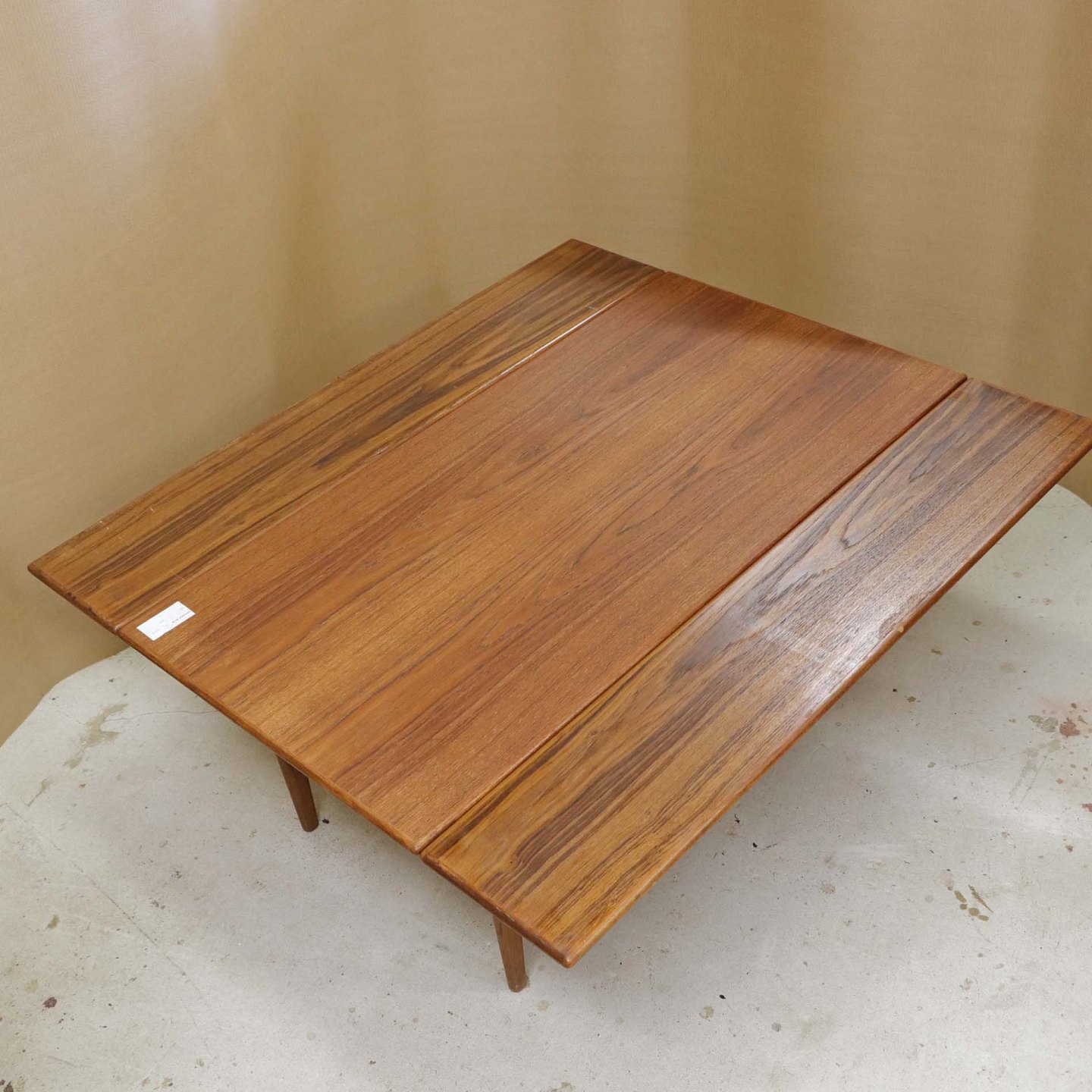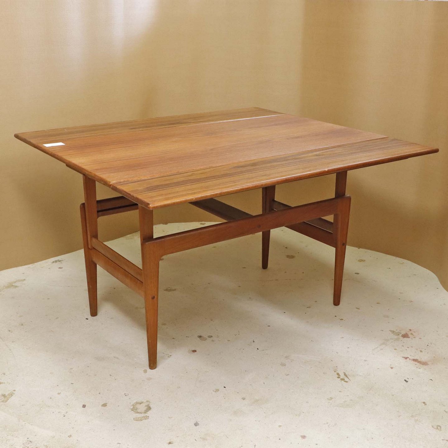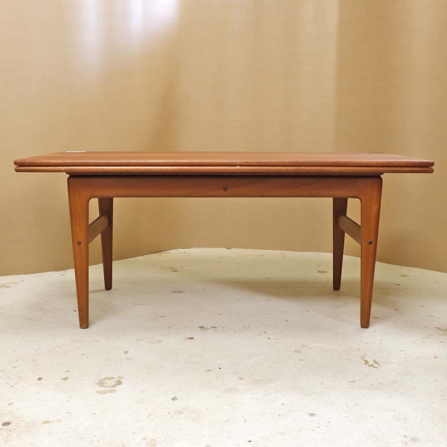 Sofa- og spisebord i samme møbel. Bordet er fremstillet i teaktræ og har to underliggende udtræksplader, som befinder sig på hver af bordets lang-sider.