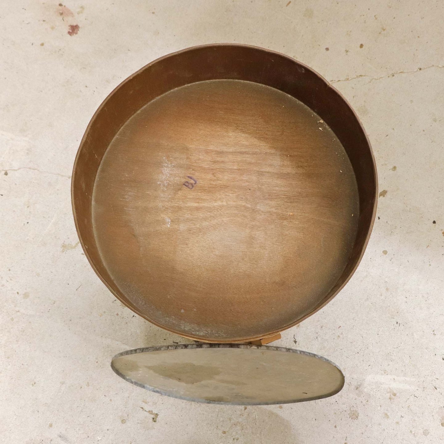 Tøndeformet kumme til blomster med stel i lakeret bøgetræ og ramme i teaktræ med gyldne dekoraktionsbånd og aftagelig bundplade i zink.