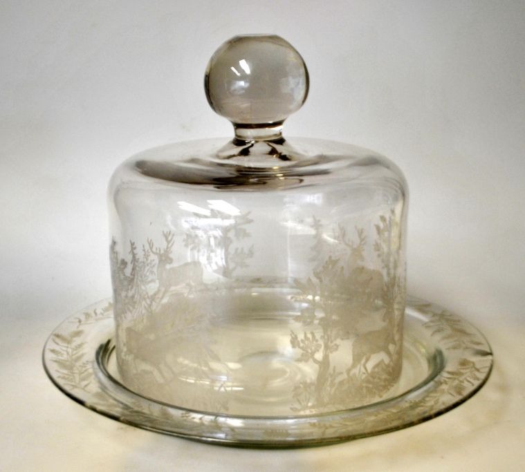 Osteklokke med hjortemotiv og tilhørende fad, ca. 1910. Holmegård, Danmark.