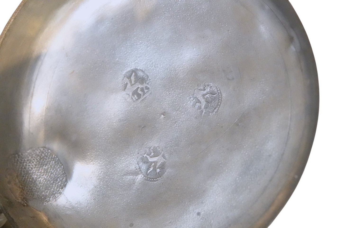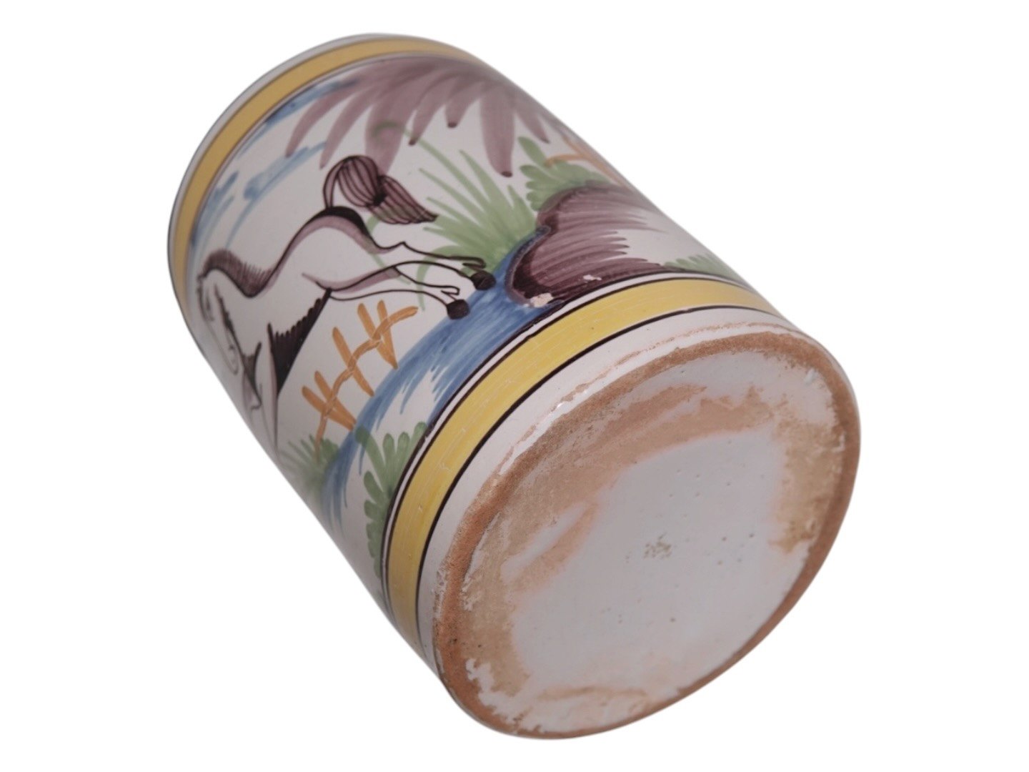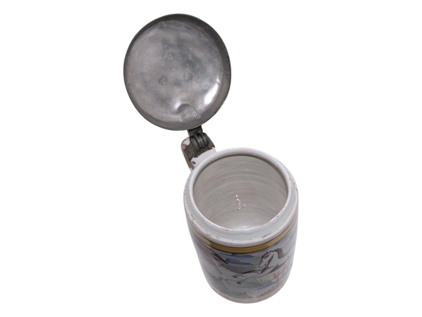 Stort fajance krus dekoreret med en hest. Der er et tinlåg der har senere inskription fra 1833. Kruset er fremstillet mellem 1790 og 1810.