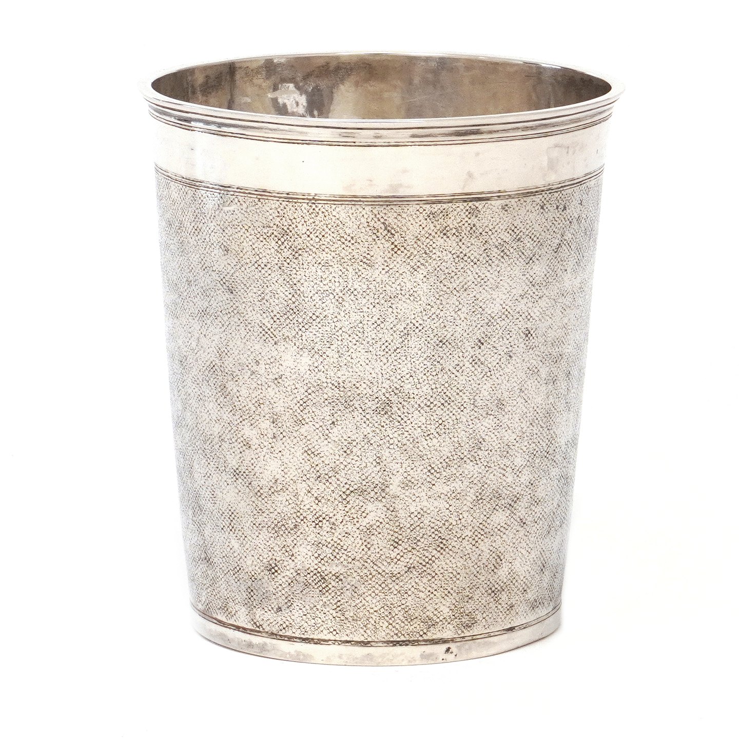 Stort nålepunslet pragtbæger i sølv. Sands. udført af Hans Nielsen Wolgast, København, før 1700-1711. Dateret 1698. H: 11,5cm. D: 9,9cm