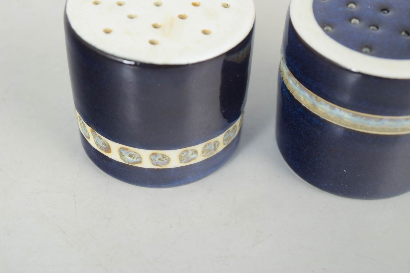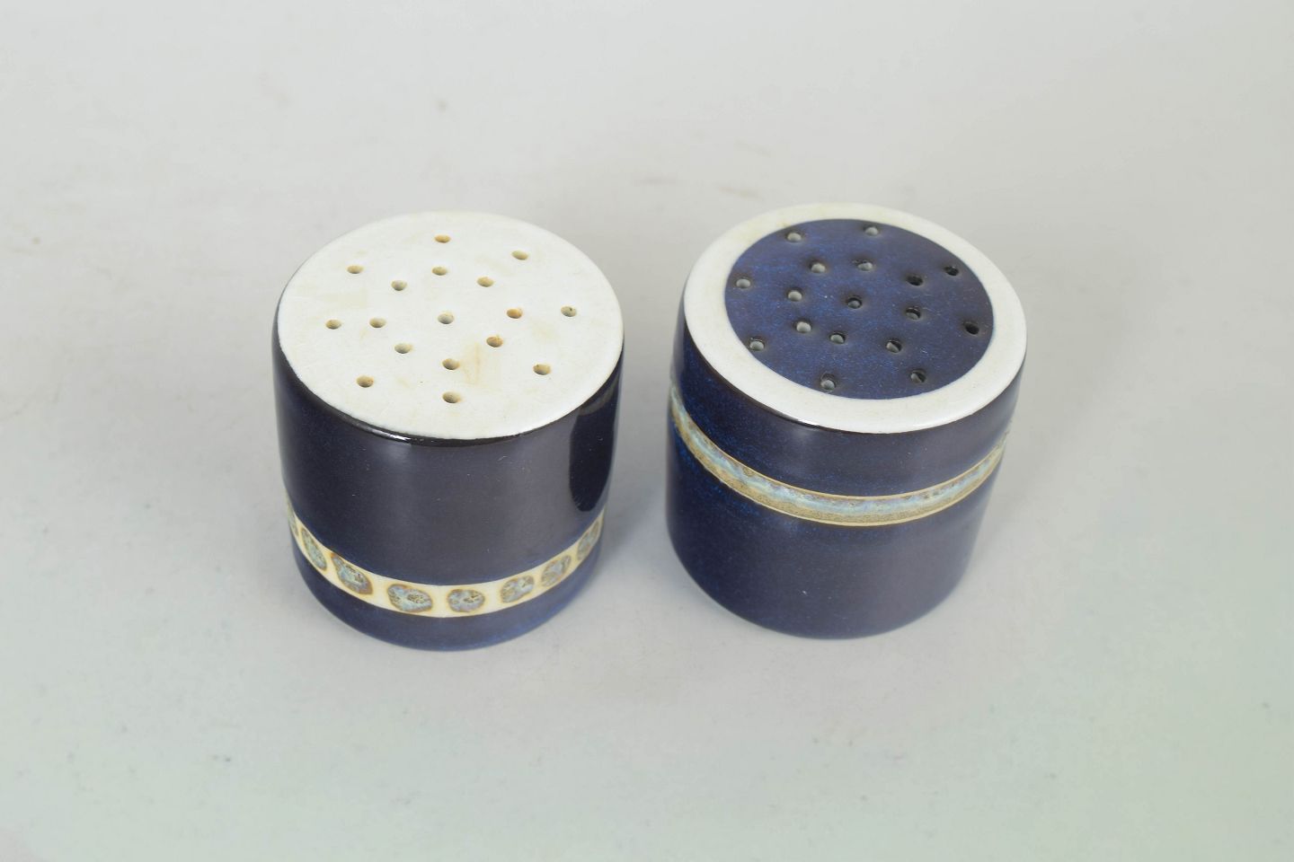 Porcelæn salt- og pebersæt fra 1956, model 582/2957, udført i kompakt cylindrisk form med dyb blå glasur og dekorative bånd med stiliseret motiv.