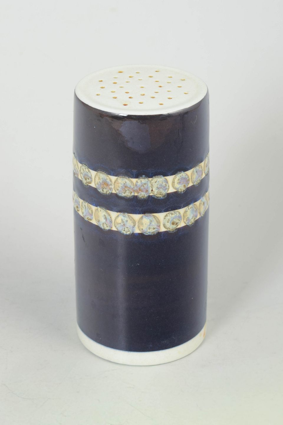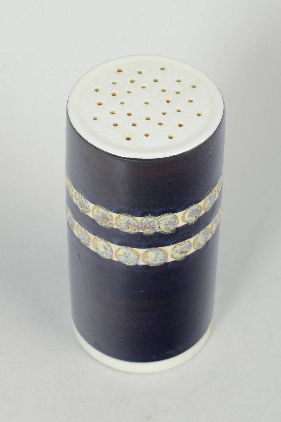 Porcelæn sukkerstrøer fra 1956, model 584/2994, udført i cylindrisk form med dyb blå glasur og dekorative bånd med stiliseret motiv.