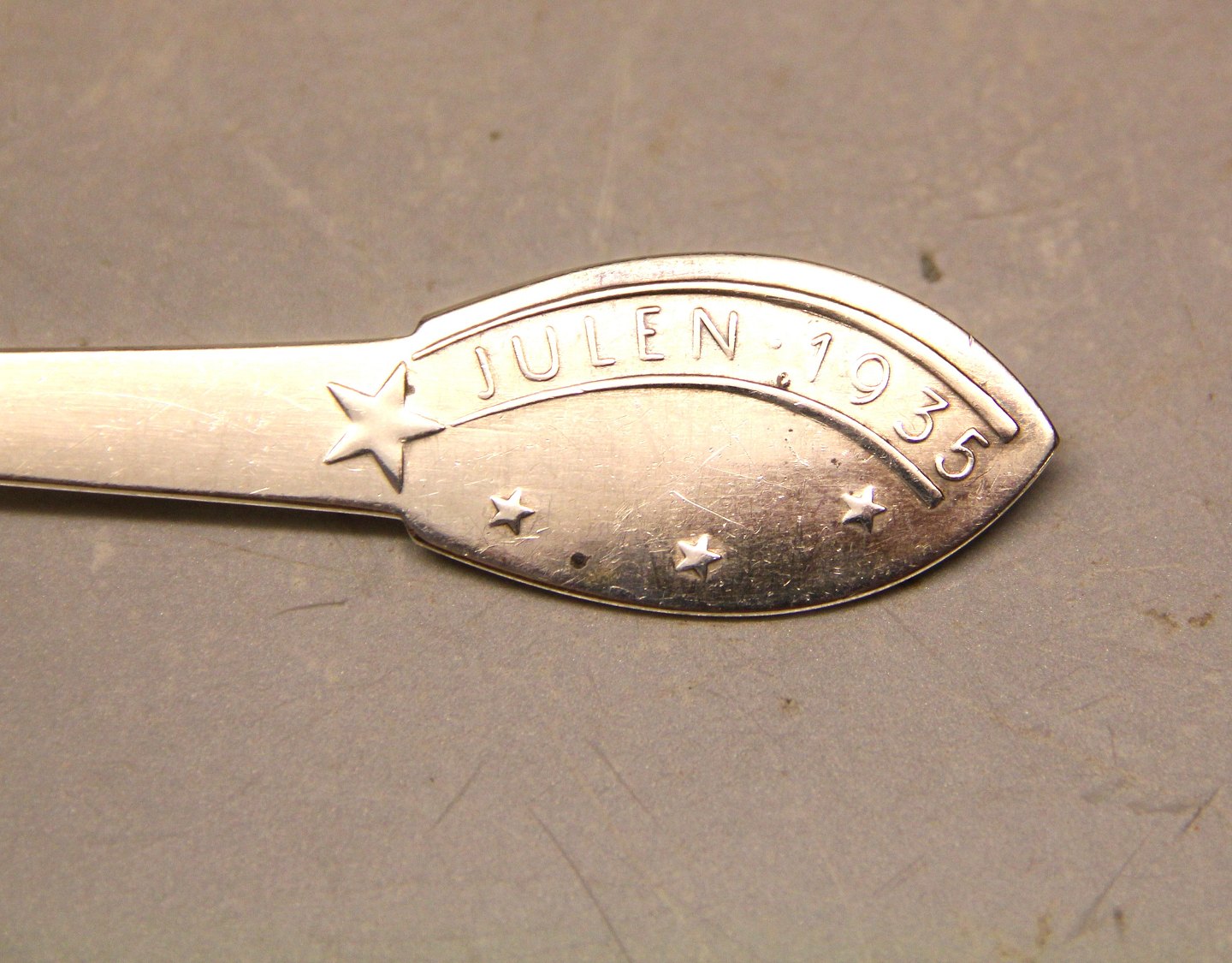 Anton Michelsen Juleske 1935 (Se billede 2 og 3) 1935 Knælende hyrde Forgyldt sølv med emaljedekoration. Design: Jais Nielsen Siden 19 10 har forskellige kunstnere designet en årsske ved juletid og siden også en tilsvarende årsgaffel. Juleskeer og julegafler i forgyldt sølv med emaljedekorationer blev først skabt hos sølvfirmaet A. Michelsen og blev i 20 03 overtaget af Georg Jensen. I 20 06 blev gaflen taget ud af produktion