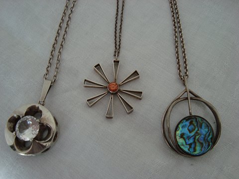 Spændende 60'er vedhæng med perlemor (diameter 4 cm) (kæden 60 cm) (Stemplet for Carl Ove Frydensberg, København, samt Sterling Denmark)(se foto) - kr. 850,00.