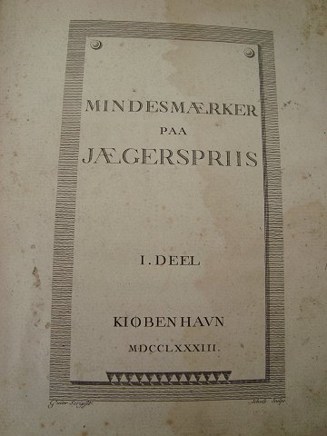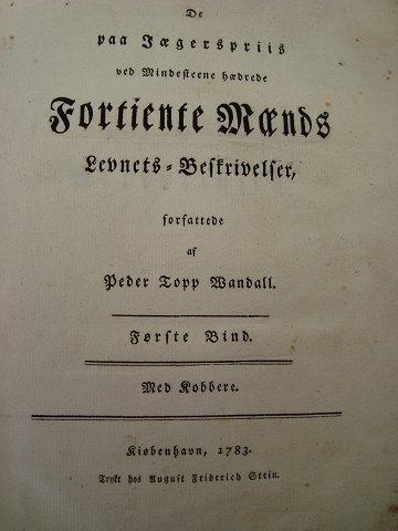 "De paa Jægerspriss ved Mindestene hædrede Fortiente Mænds Levnets=Beskrivelser. Bd. I Kiøbenhavn 1783 i noget slidt læder.