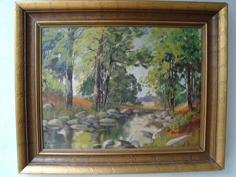 Maleri af P. Avnø - "Vandløb gennem skov"