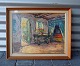 Maleri af Thorvald Petersen - Interiør fra stue med kvinde der sætter hår. ...