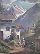 Maleri af Peer Lorentz Dahl - Landskab med arbejdende personer ved ejendom.