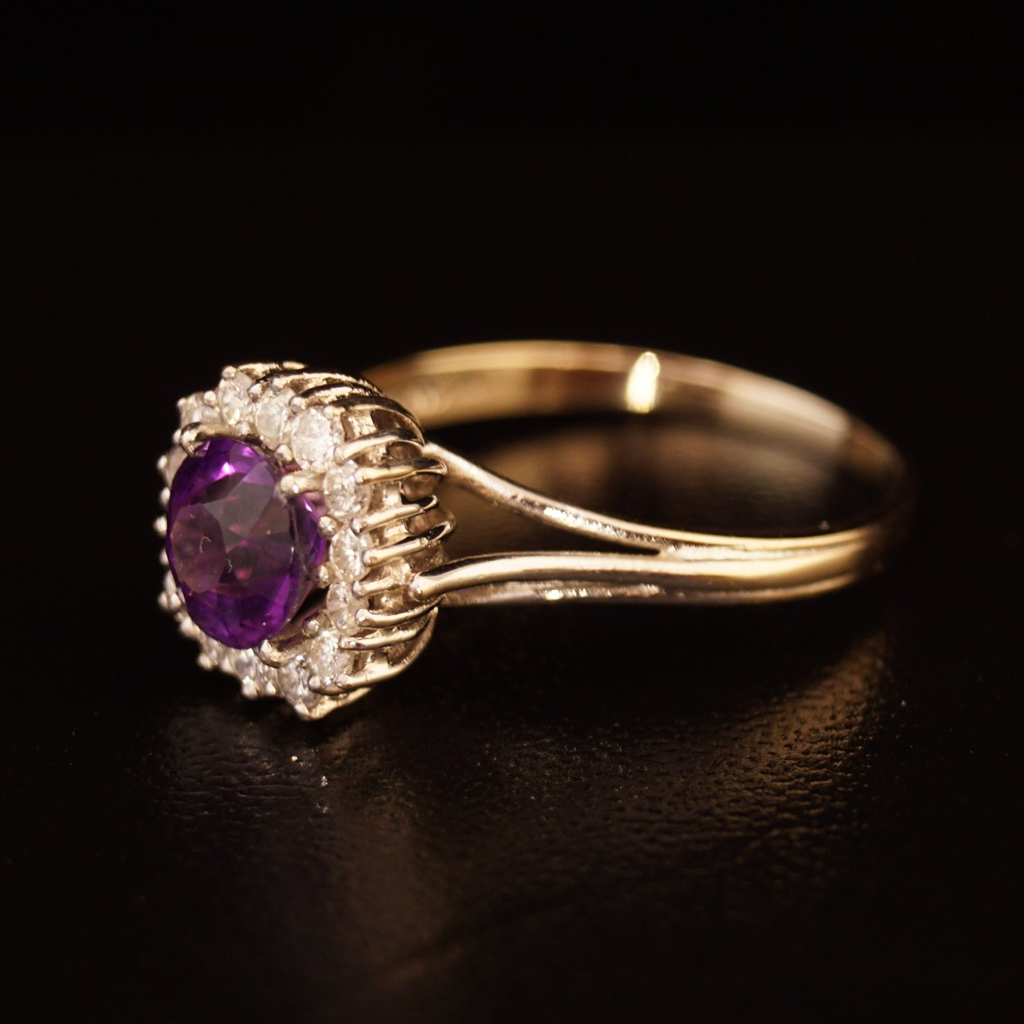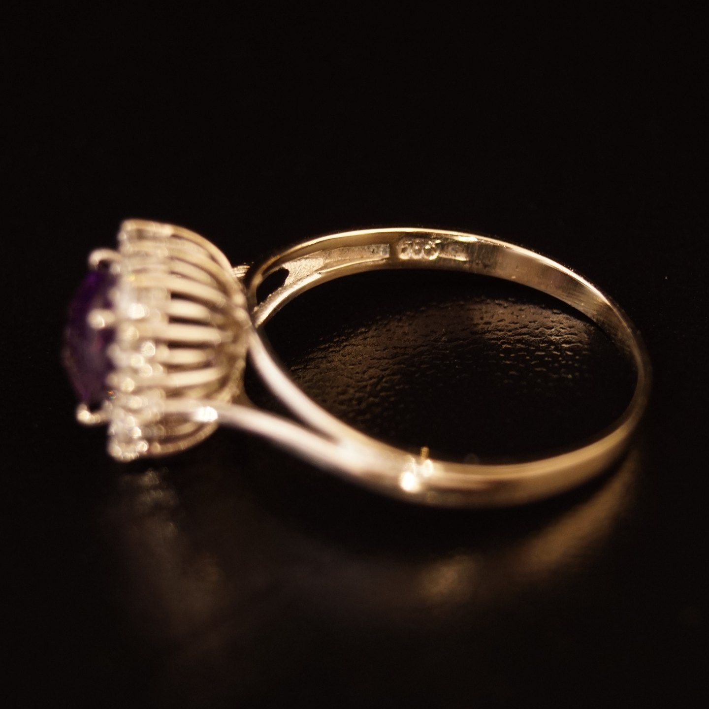 Ring af 14 kt. hvidguld, prydet med 1 facetslebet ametyst omkranset af 14 brillantslebene diamanter på i alt ca. 0,56 ct. Wesselton. SI. Ring str. 61.