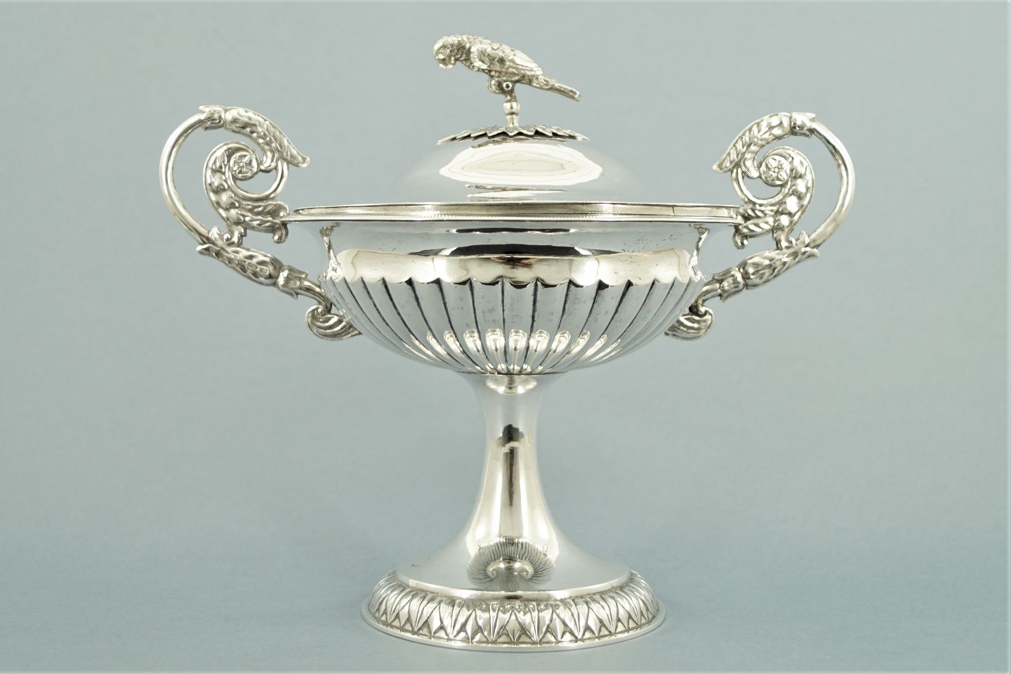 Svensk cirkulær opsats af sølv med låg. Opsatsen er prydet med to håndtag, låget prydet med en papegøje.