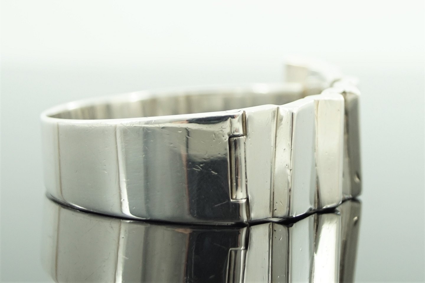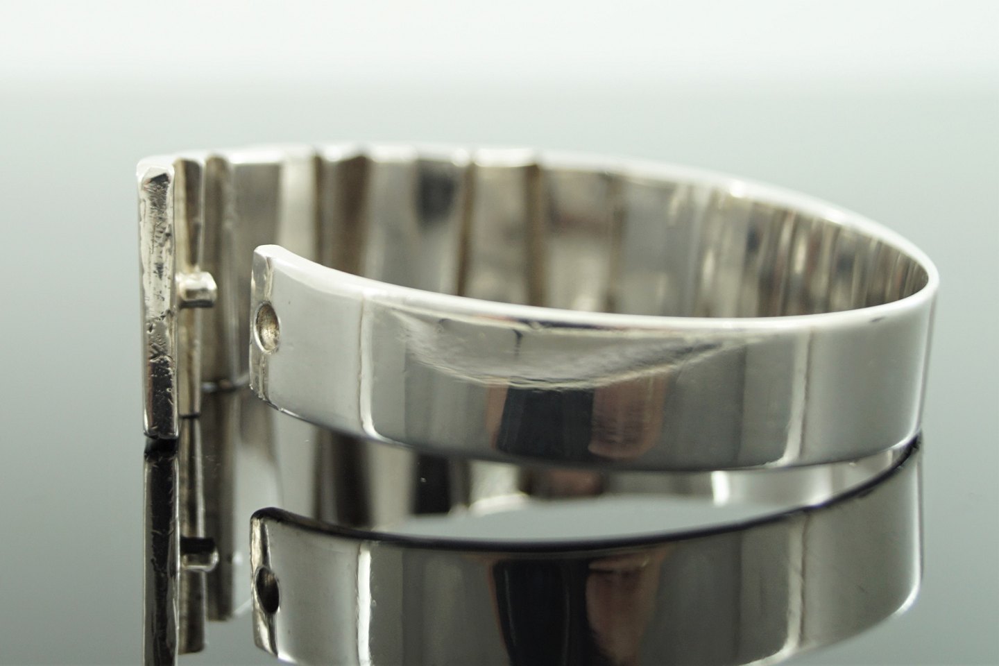 Søren Borup; Armring, som kan åbnes, af massiv sterling sølv. Indvendige mål 5,7 cm x 5,3 cm.