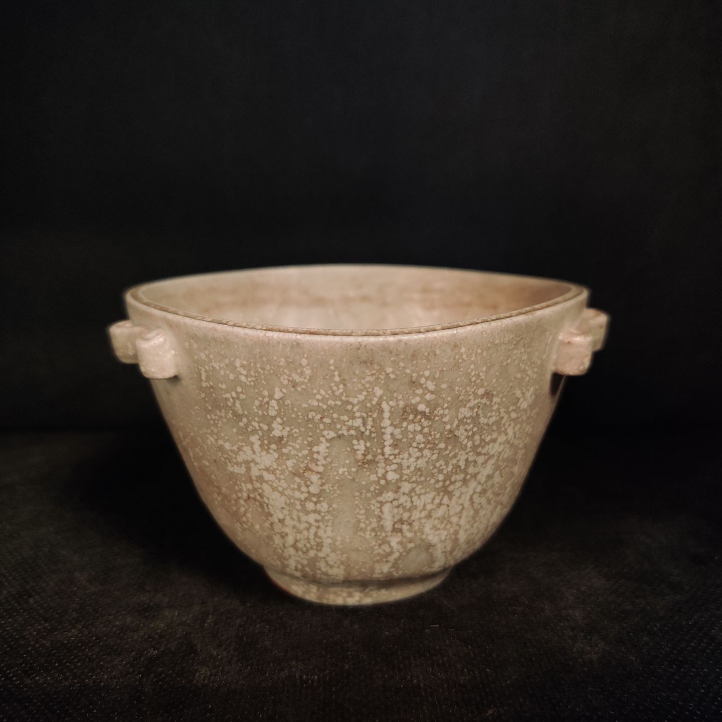 Arne Bang; Skål af stentøj i en tilnærmet trekantet form #68. Dekoreret i sandfarvet glasur.