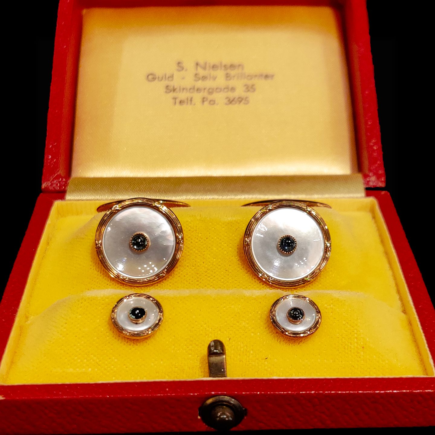 A dress jewellery set comprising a pair of cuff links and a pair of studs. Each set with sapphire and morther-of-pearl, mounted in 14k gold.