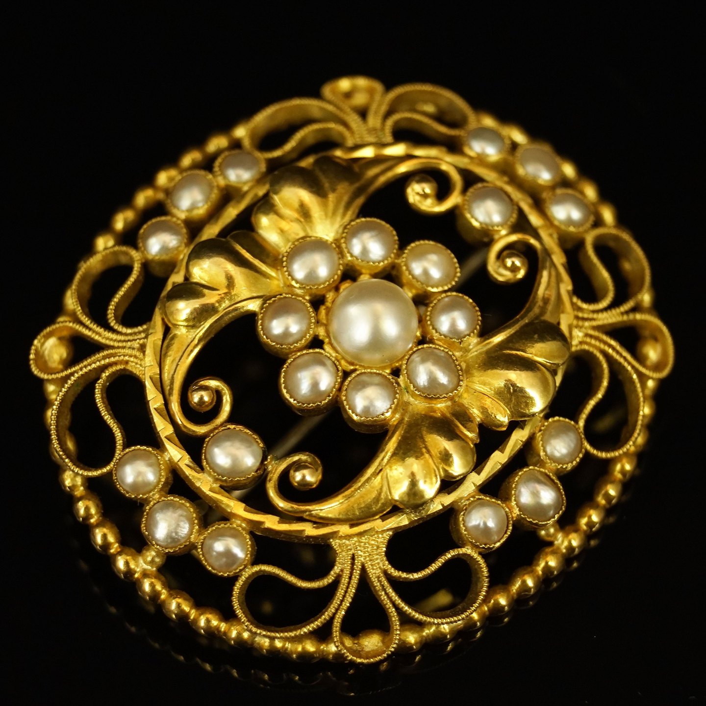 Georg Jensen; Stor oval broche i 18 kt. guld med perler