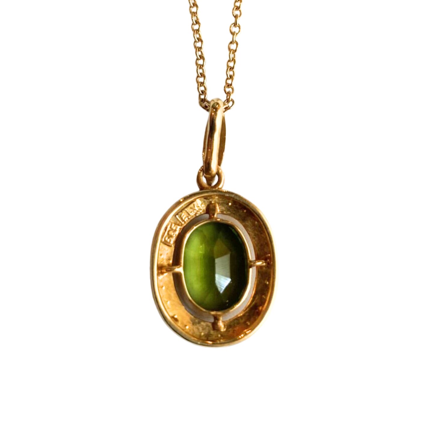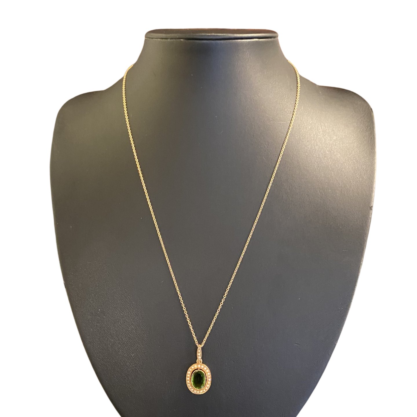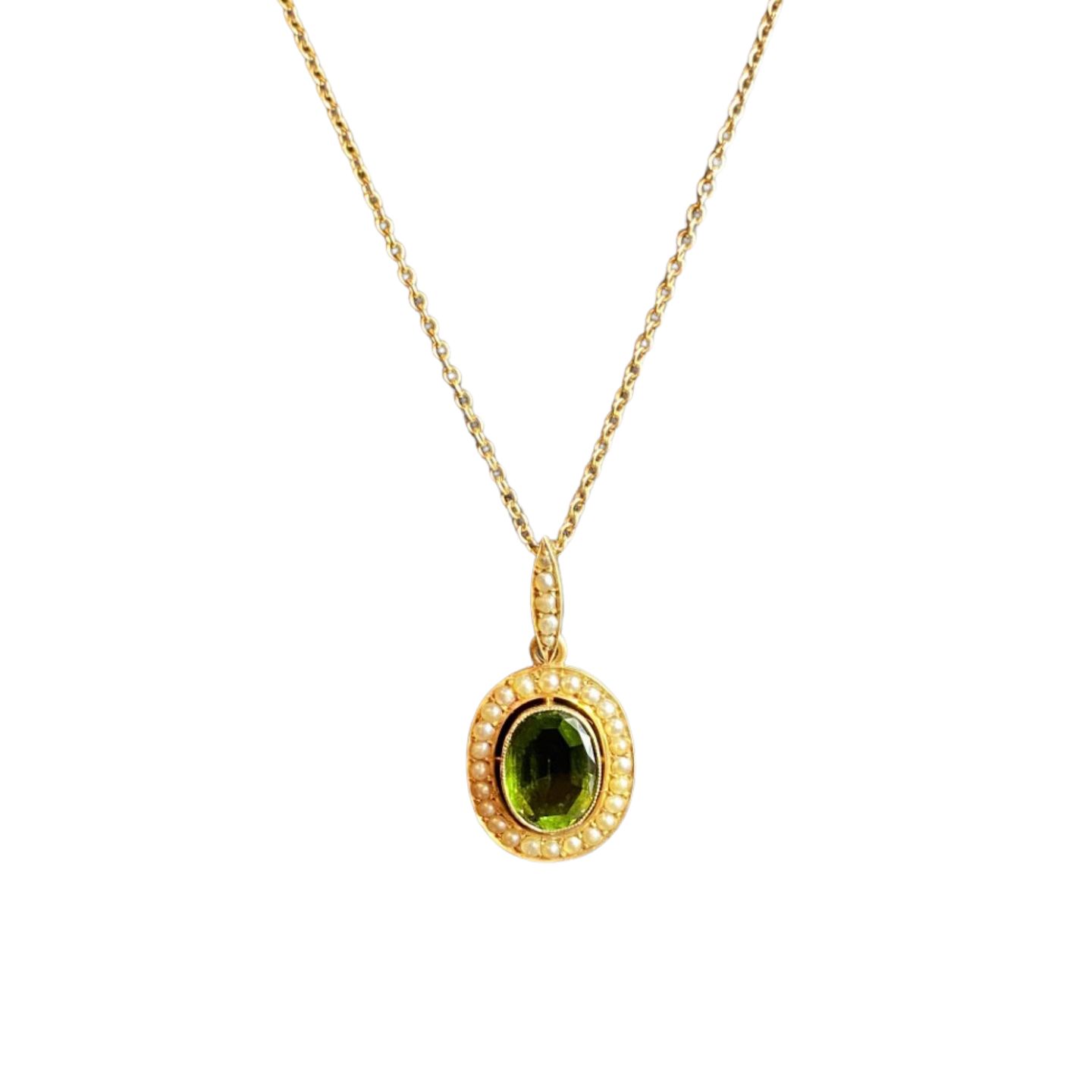 E. L. Weimann; A necklace in 14k gold set with peridot and pearls.