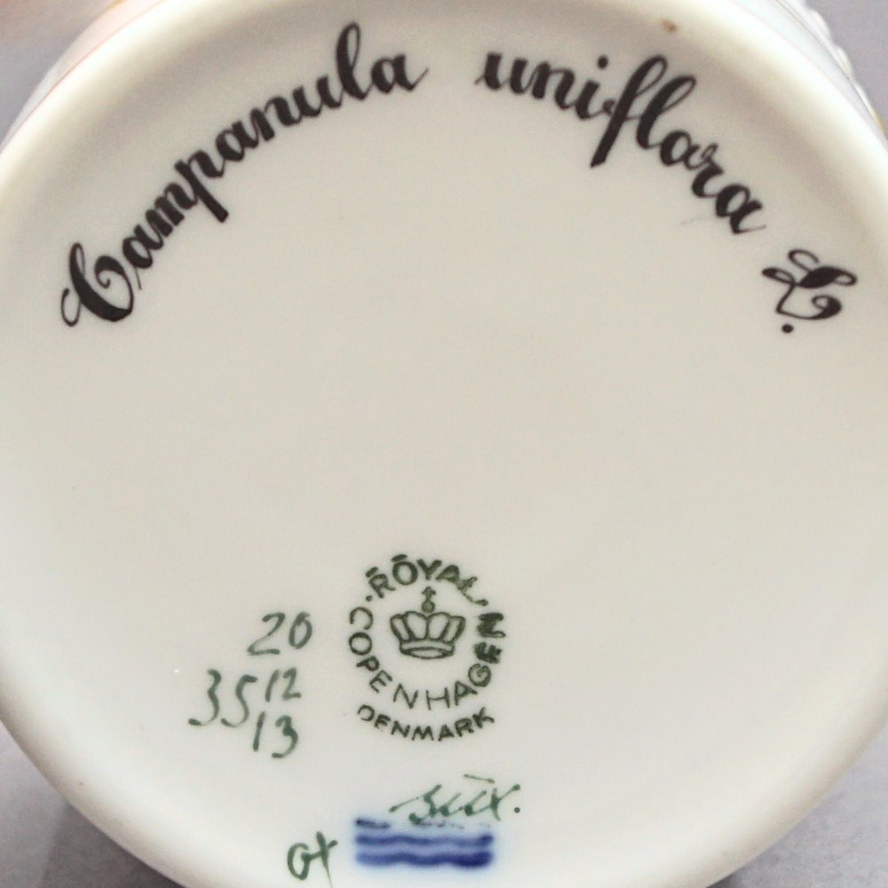 Dekoration: Campanula uniflora L. (Enblomstret klokke). Kop h. 6,5 cm. Underkop diam. 14 cm.