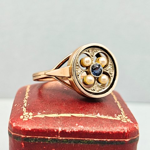 Ring i 9 kt. guld prydet med safir, perler og diamanter fattet i hvidguld. Omkring år 1920 - 1930. Ring str. 54. Ring pynt (rund) diameter 13 mm.