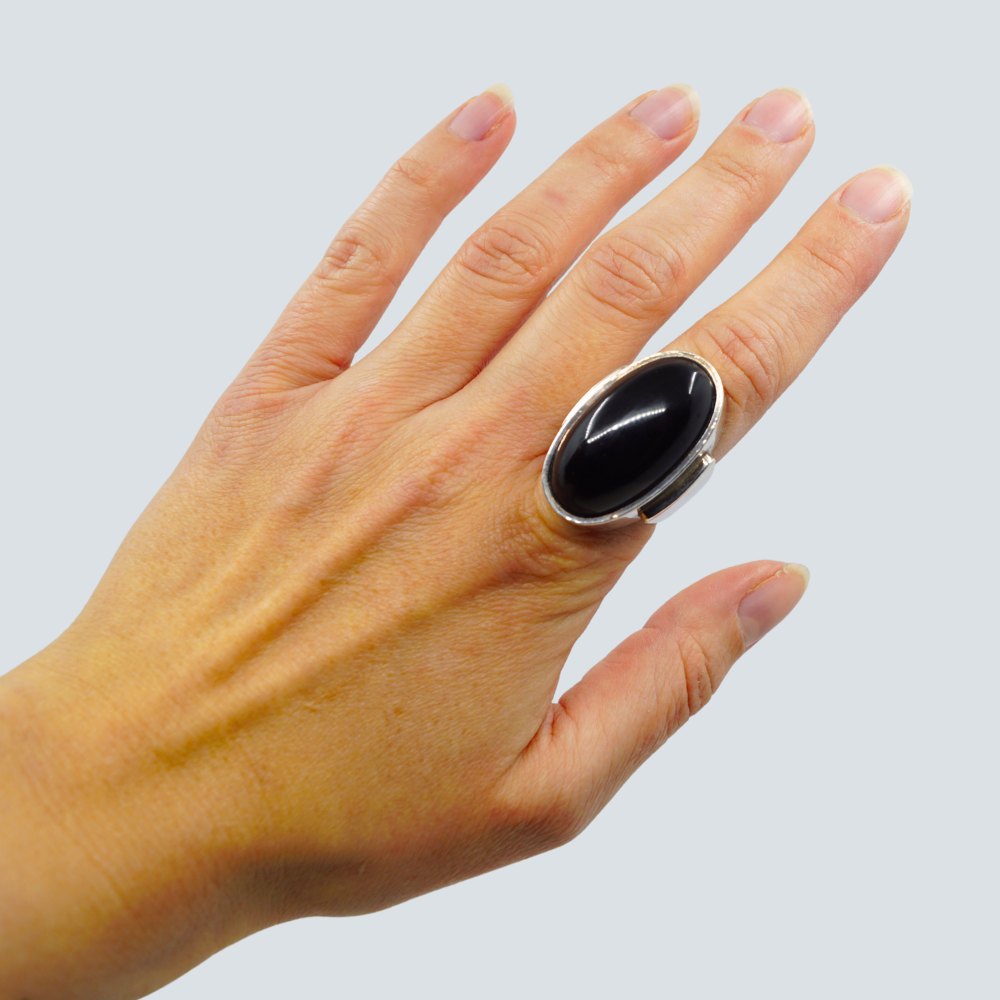 Georg Jensen; Ring af sterling sølv prydet med stor oval onyx.