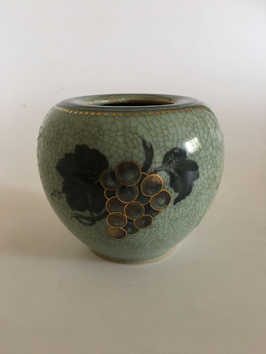 Royal Copenhagen Cracle Glaze vase in Green and gold with grapes. Marked with 3 waves, 5060/2237 and efx. Measures 9cm high and is in good condition.