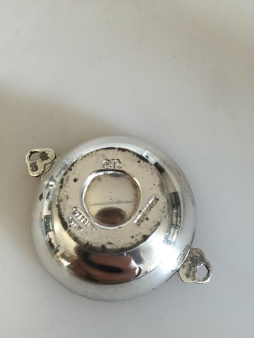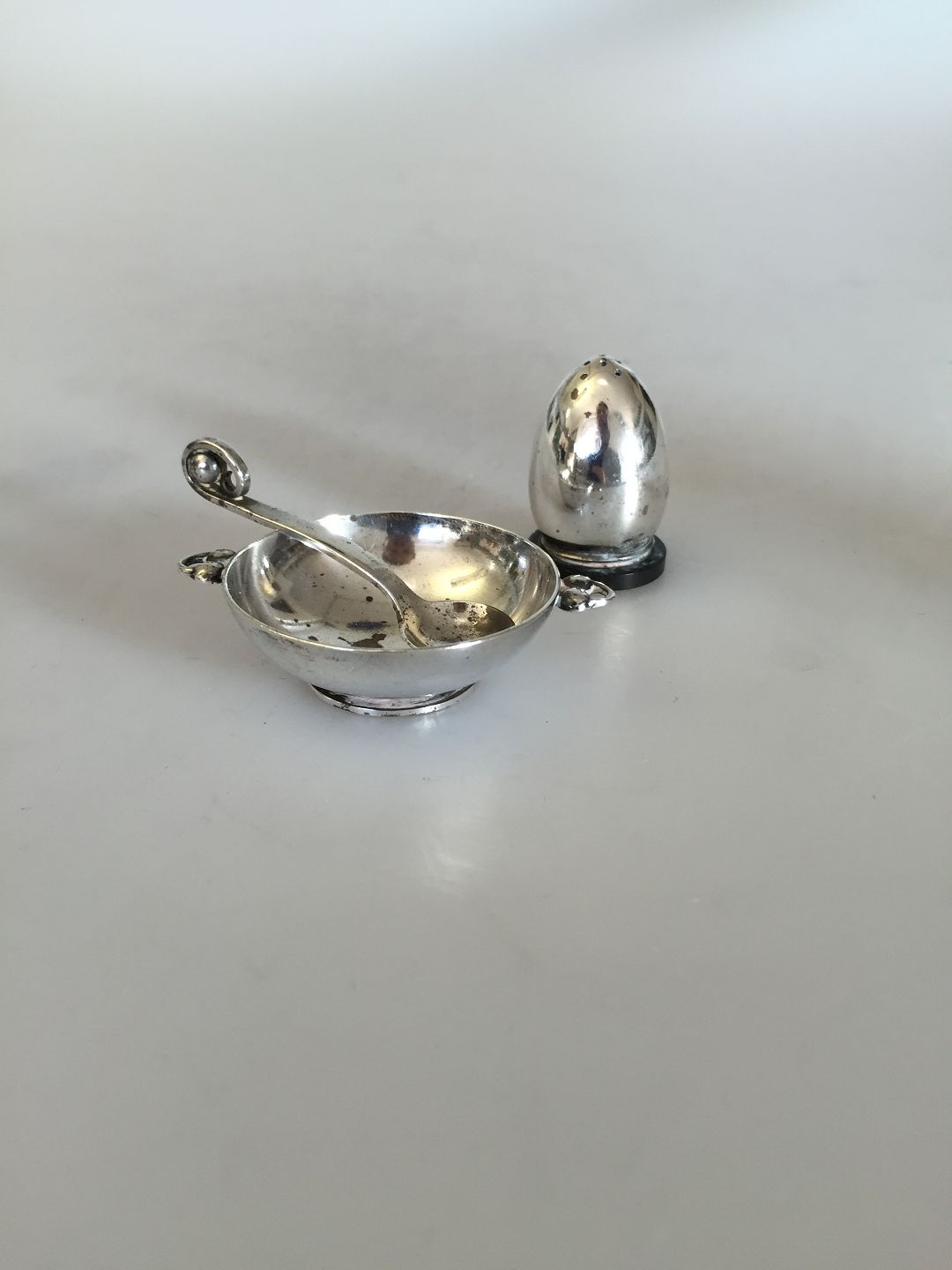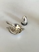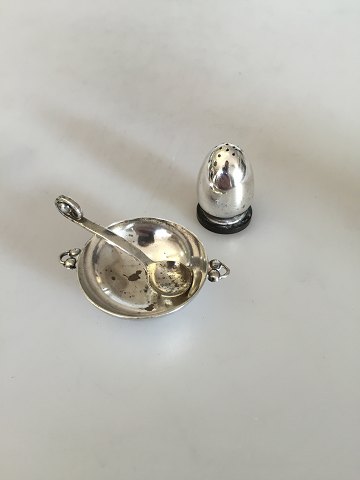 Evald Nielsen Saltkar med ske og peberbøsse i sterling sølv og 830. Kar måler 5,5cm og bøsse 3,1cm høj. Fremstår i god stand.