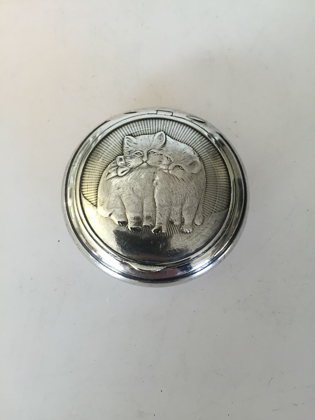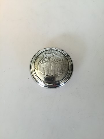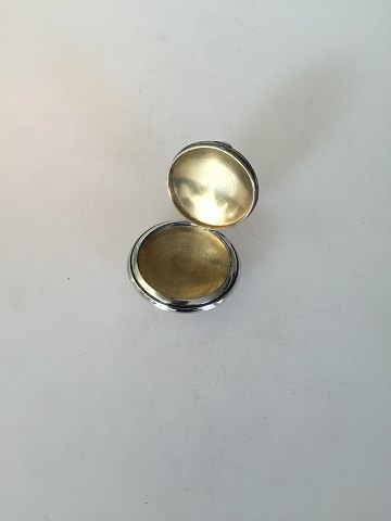 Pille . Snus Box i Sølv med to katte. Måler 5,2cm dia. Indvendig forgyldt. Sølvmærke er 800 og så mester stemple, som vi ikke kan tyde. I god stand. Katte motiv foran og bag på.