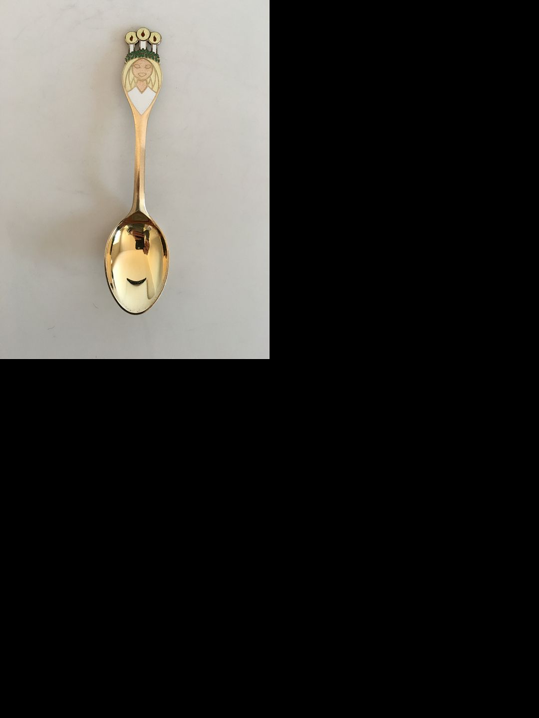 Lucia Bruden er årets motiv, og Henry Theander er kunstneren. Øverst på skaftet er den smilende Lucia Brud. Hun har den grønne krans med de levende lys i hvid emalje placeret i sit gyldne hår.