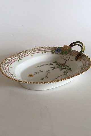 Royal Copenhagen Flora Danica Leafshaped dish with handle 20/3541 new number 357. The flower is: "Potentilla nivea L.". Measures 24,5cm, first quality and in perfect condition.