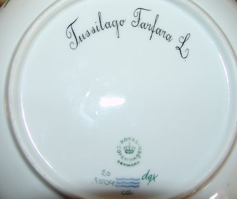 Kgl. Porcelæn Flora Danica Skål No 3504. Latinsk navn "Tussilago Farfara L. I god stand. Er mærket som en anden sortering, men er ikke privat malet. Måler 23cm. Royal Copenhagen